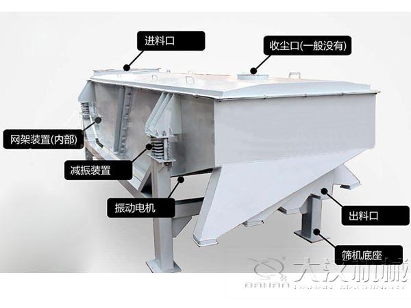 主要由篩箱、篩框、篩網、振動電機、電機臺座、減振彈簧、支架等部分組成。