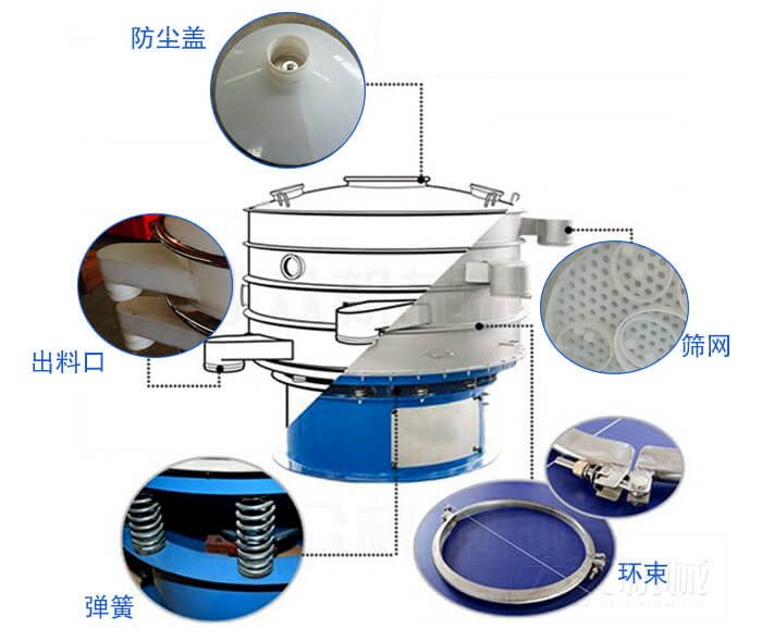 塑料振動篩主要由進料口、防塵蓋、出料口、束環(huán)、篩網(wǎng)、配重塊、上部重錘、振動體、振動電機、彈簧、下部重錘、機座等部分組成。