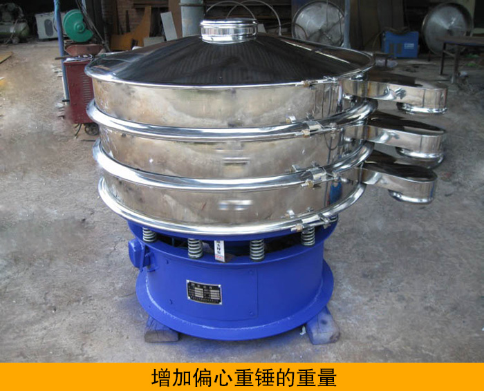 增加偏心重錘的重量,就可以增加整機的激振力,用戶可以根據振動篩的層數,不同的物料比重,按照操作說明規范適量的增加重錘的重量,從而使振動篩和物料都能達到自己想要的篩分效果。
