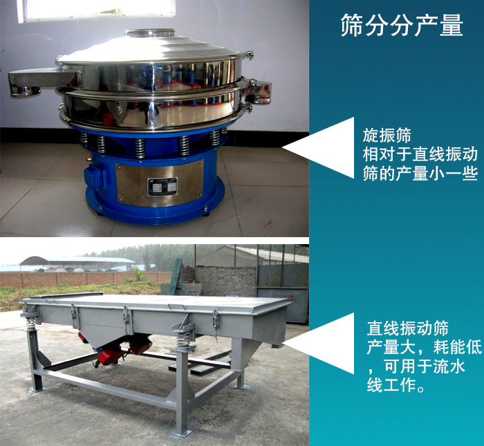 旋振篩相對于直線振動篩的產量小一些,直線振動篩產量大,耗能低,可用于流水線工作。