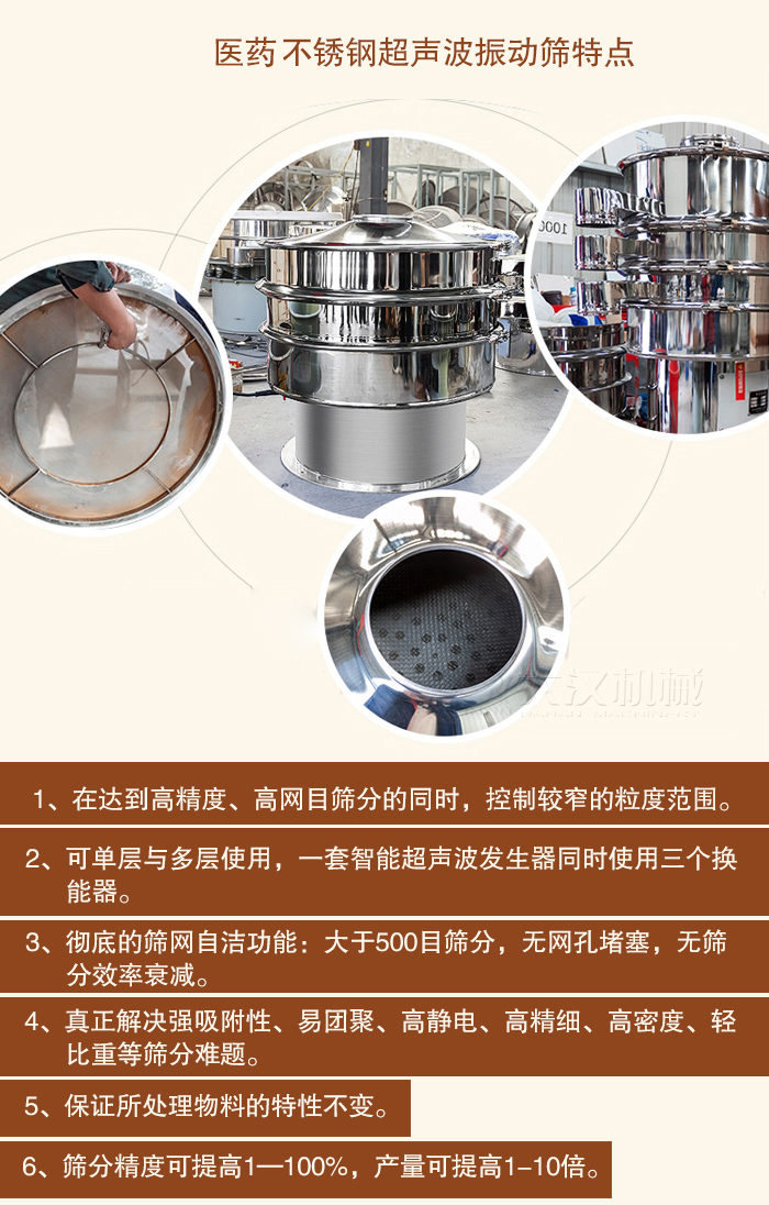 5、篩網(wǎng): 適用于10目~635目。醫(yī)藥不銹鋼超聲波振動篩工作原理:超聲波篩分系統(tǒng)由超聲波諧振電源、振蕩器、共振環(huán)組成。