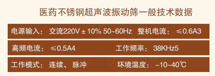 醫(yī)藥不銹鋼超聲波振動篩一般技術數(shù)據(jù):醫(yī)藥不銹鋼超聲波振動篩超聲波諧振電源:1、電源輸入: 交流220V±10% 50~60Hz2、整機電流: ≤0.6A3、高頻電流: ≤0.5A4、工作頻率: 38KHz5、工作模式: 連續(xù)、 脈沖6、環(huán)境溫度: -10~40℃
