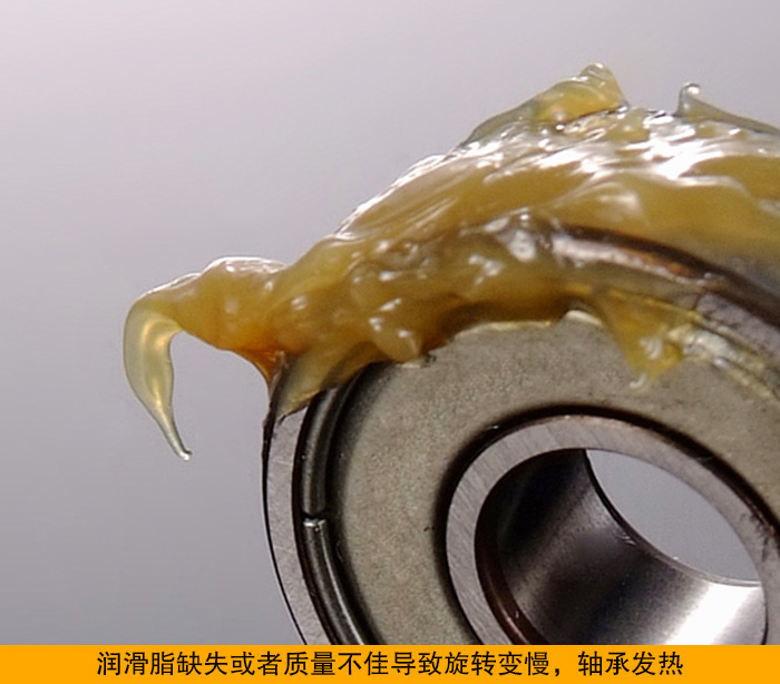 原因:維護和保養的頻率跟不上,軸承缺潤滑脂,如果是新添加的油脂,要么是油脂的質量問題,要么是加得太滿,劣質油使軸承堵塞。