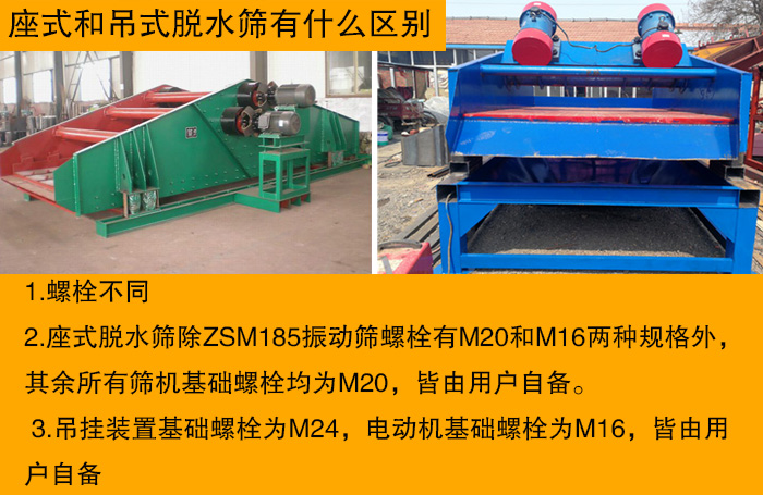 座式脫水篩除ZSM185振動篩螺栓有M20和M16兩種規格外,其余所有篩機基礎螺栓均為M20,皆由用戶自備。