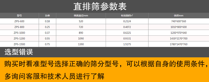 用戶在選用型號時應(yīng)根據(jù)實際產(chǎn)量、顆粒大小不同選擇合適的機型,比如:比重為每立方1噸的物料選擇目數(shù)為50目的篩網(wǎng),采用ZPS-1000型直排篩,則生產(chǎn)量大概在1.5t/h,用戶要有一個大概的了解,避免選型錯誤造成效率低下。
