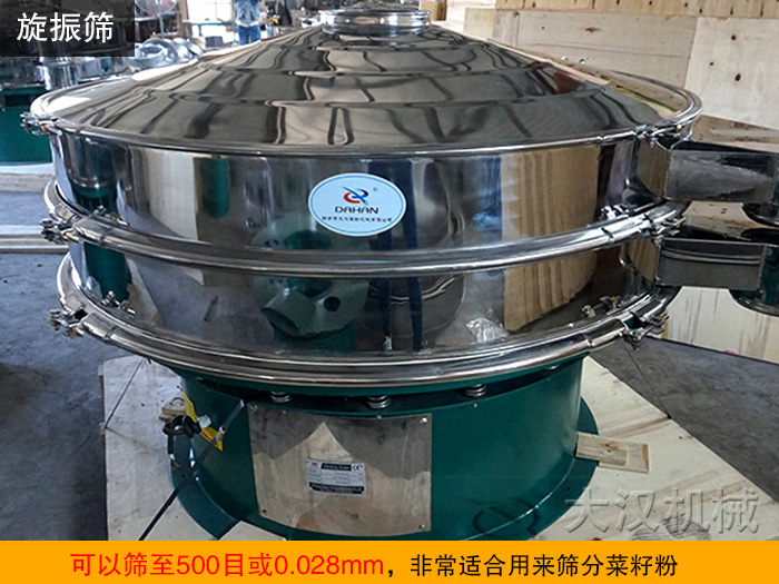 旋振篩是采用直立式電機作為激振源,電機上下兩端安裝有偏心重錘,將電機的旋轉運動變為水平、垂直和傾斜的三次元運動,再把這個運動傳往篩面。調節上下兩端的相位角,可以改變菜籽在篩面上的運動軌跡。菜籽粉是一種精細物料,旋振篩可以篩至500目或0.028mm,非常適合用來篩分菜籽粉。