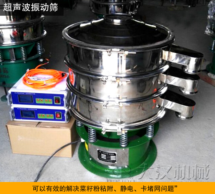 超聲波振動篩是將220V,50Hz電能轉化為38KHz的高頻電能,輸入超聲波換能器,將其變為38KHz機械振動,從而達到高效篩分和情網的目的,非常適合精微細粉篩分。菜籽粉是一種具有粘附效應,易產生靜電的物料,而超聲波振動篩作為堵網克星,可以輕易的解決粘附、靜電、卡堵網問題。